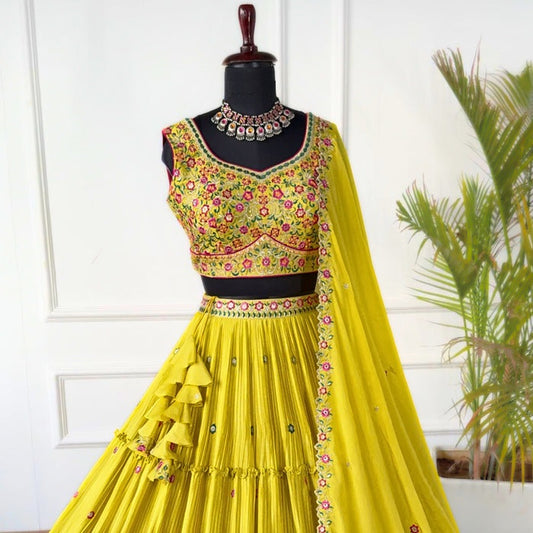 Yellow color Crush & Mirror Embroidery work Ruffle Style Lehenga Choli for any function