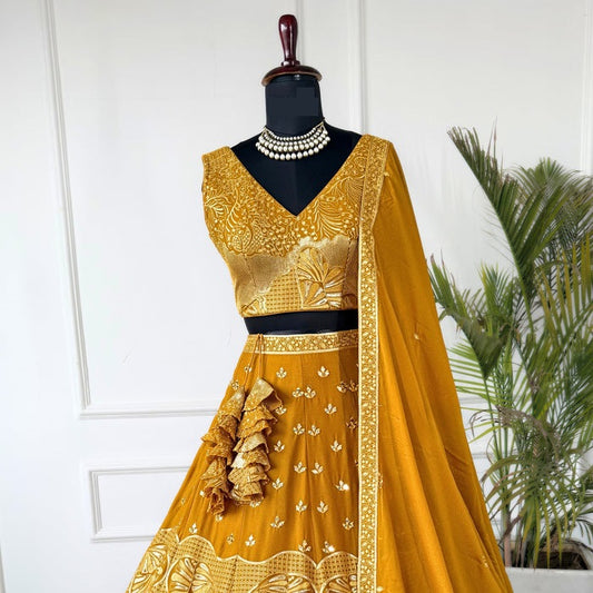 Golden color Real Mirror & Sequence Embroidery work Designer Lehenga Choli for Wedding Function